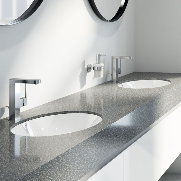 The clean, crisp angles of the Plus faucet accentuate the modern aesthetic and create a harmonious look with a sleek, square sink.