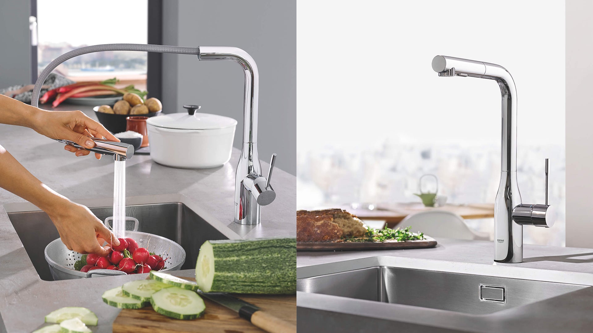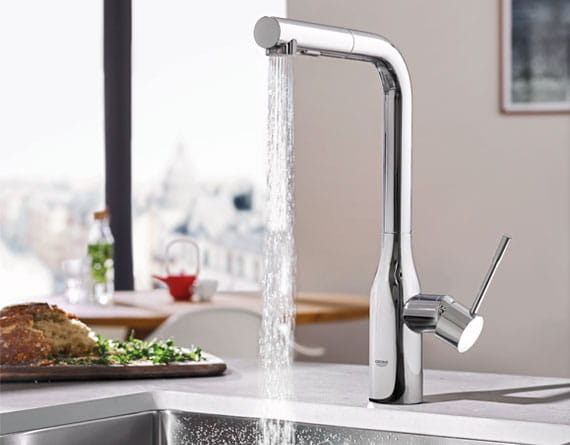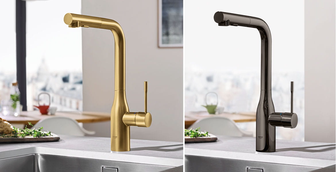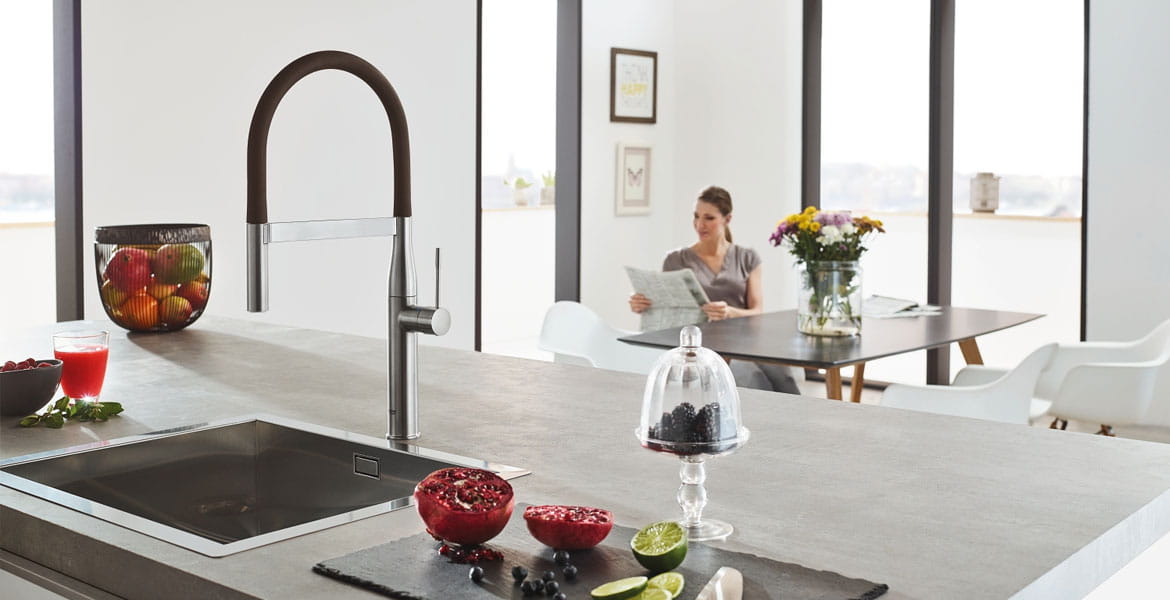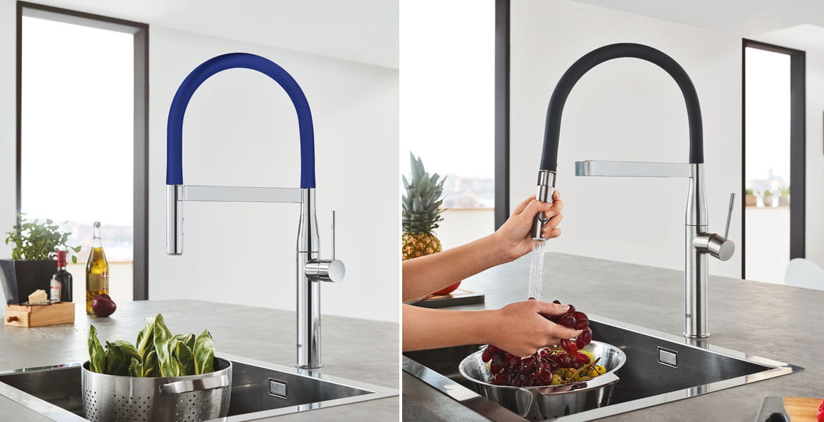 Clean lines and cylindrical modern design make the NEW GROHE Essence the natural choice for today’s cosmopolitan kitchen. The extended comfort spout height embodies minimalist beauty in its purist form, while the pull-out dual spray with toggle function allows for seamless switching between spray and regular water flow. Furthermore, the forward-rotating lever handle eliminates backsplash interference.