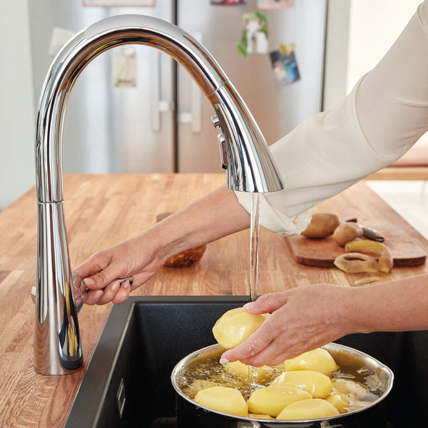 The GROHE Zedra dual spray faucets are available in two designs – C-shaped and L-shaped. Each incorporates the stream spray as well as the shower spray making everyday kitchen tasks easier.
