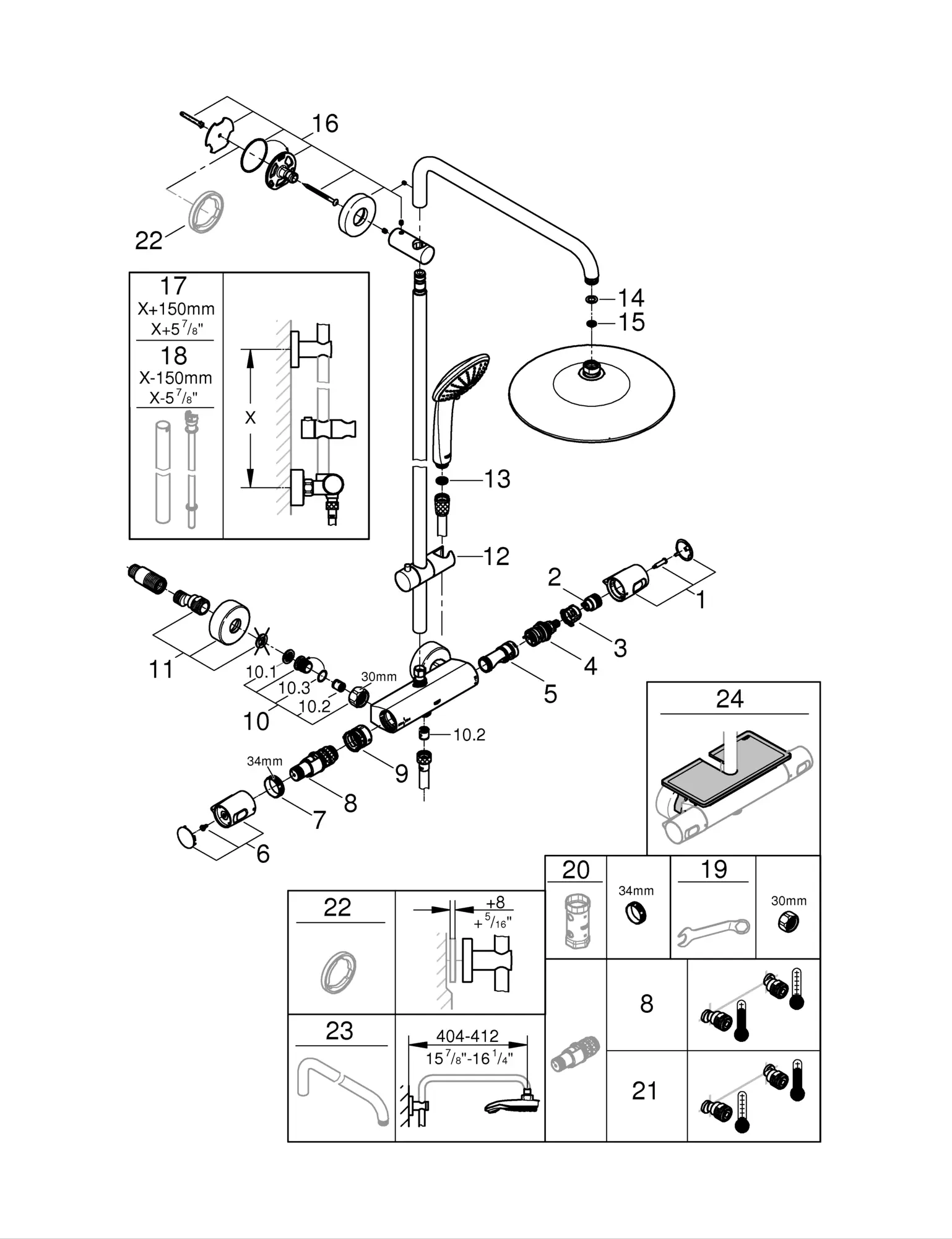 • System includes GROHE CoolTouch thermostatic control, shower head, shower arm, bar with hand-shower bracket, hand shower and metal hose