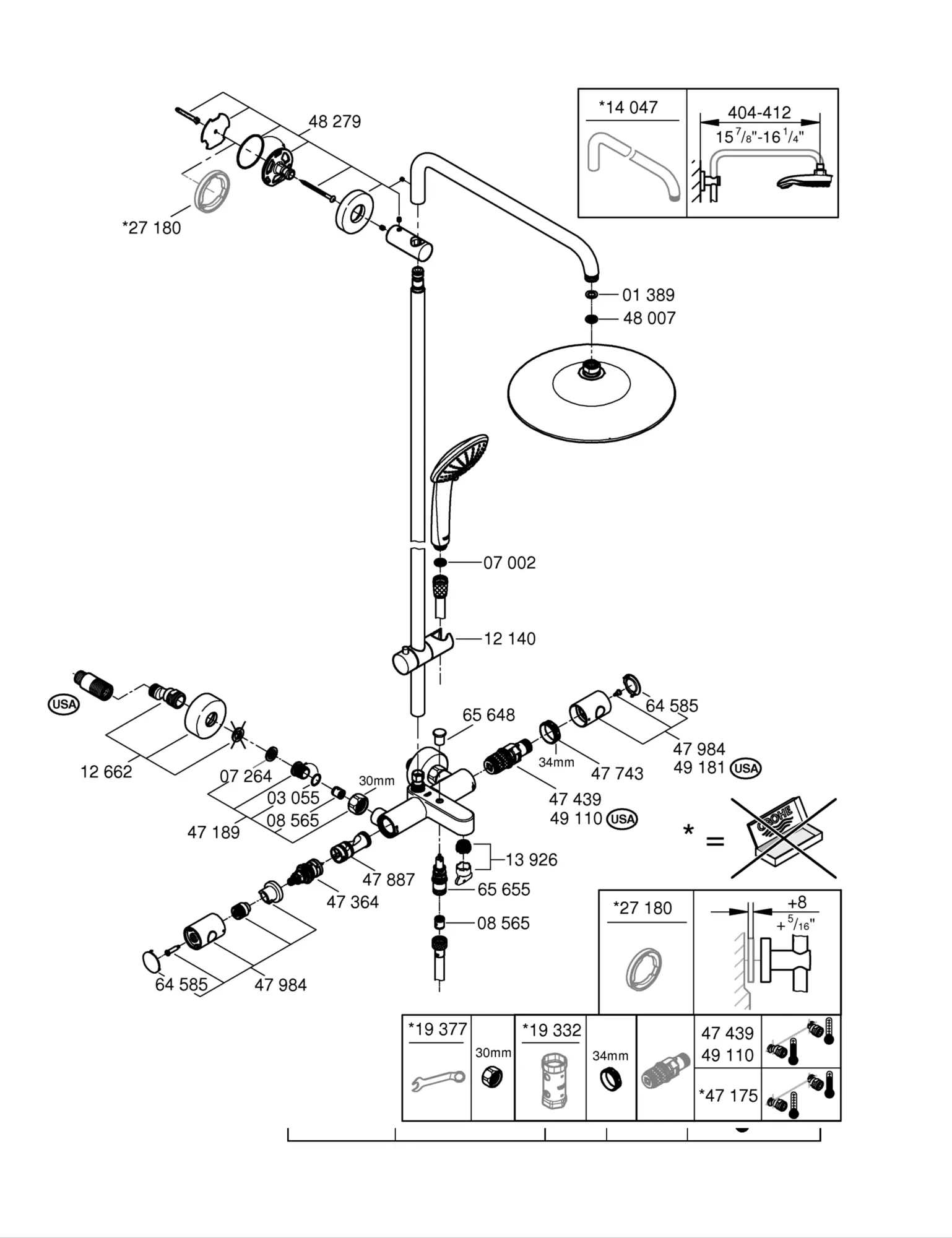 • System includes GROHE thermostatic control with integrated tub spout, shower head, shower arm, bar with hand-shower bracket, hand shower, metal hose